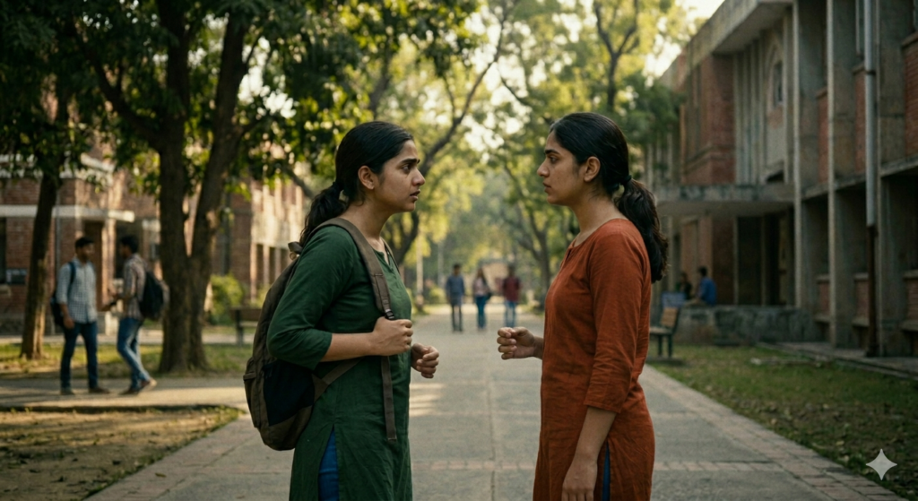 “ಹ್ಮ್ ಸರಿ”ಎನ್ನುತ್ತಾ ಮೀರಾ ಕಾಲೇಜ್ ಒಳಗೆ ಹೋಗಲು ಶುರುಮಾಡಿದಳು.ಅವಳನ್ನು ದೂರದಿಂದ ಯಾರೋ ನೋಡಿದಂತೆ ಅನಿಸಿ ಹಿಂದೆ ತಿರುಗಿ ನೋಡಿದಳು.ಆದರೆ ಯಾರೊಬ್ಬರ ಸುಳಿವು ಅವಳಿಗೆ ತಿಳಿಯಲಿಲ್ಲ.ಮುಂದೆ ಸಾಗಿದಳು ಈ ಬಾರಿ ಯಾರೋ ಹಿಂಬಾಲಿಸಿದಂತೆ ಅನಿಸಿ ಒಮ್ಮೆಲೇ ಹಿಂದೆ ತಿರುಗಿದಳು ಮತ್ತೂ ಅವಳಿಗೆ ಯಾರೆಂದು ತಿಳಿಯಲಿಲ್ಲ. ತಲೆಕೆಡಿಸಿಕೊಳ್ಳದೆ ಮತ್ತೆ ಮುಂದೆ ಸಾಗುತ್ತಿರುವಾಗ”ಮೀರಾ”ಎಂಬ ಕೂಗು ಕೇಳಿಸಿತು.ಗಕ್ಕನೆ ಹಿಂದೆ ತಿರುಗಿ ನೋಡಿದರೆ ನಿಧಿ.